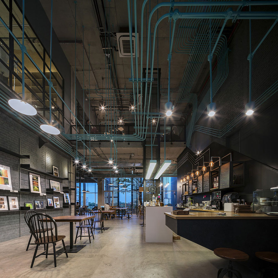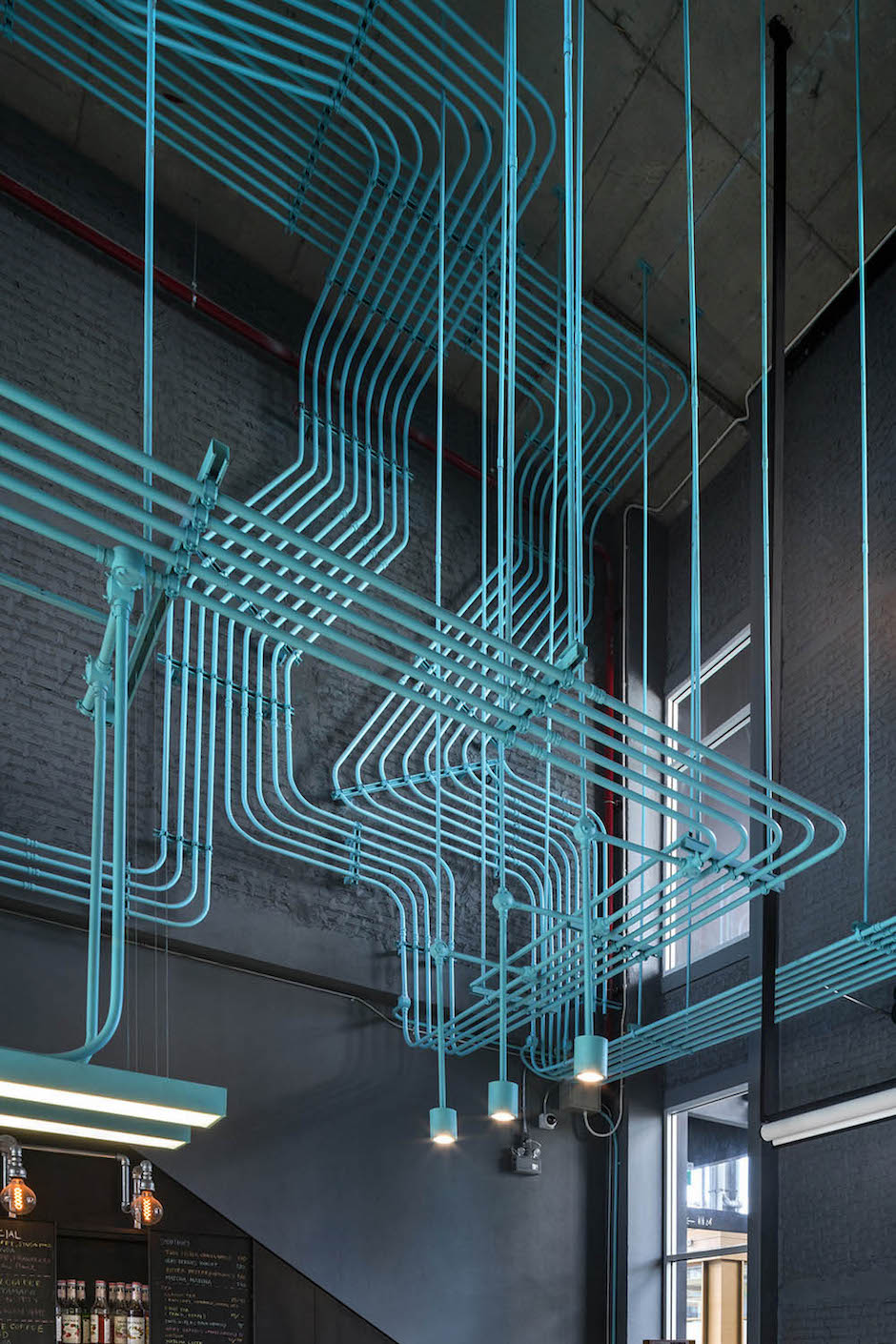 Hubba-to的創意靈感源自于Hubba的網絡狀標志圖形,設計強化并延續這種網絡線條,將其演化為有趣的空間元素,蔓延穿梭于一至二樓從而形成統一的視覺空間。這樣的構想之所以能實現,是因為現實施工中確實存在許多的機電設備管線。Supermachine設計團隊只要善加利用這些管線、并刻意強化增加管線系統、然后有目的的設計組織管線安裝路徑。縱橫交錯的管線一律噴成漂亮的綠松石色彩,流暢的藍綠色管道在墻面、天花、空間中婉轉穿梭,營造出令人震撼的視覺效果,為沉重的工業風帶來靈動和創新。